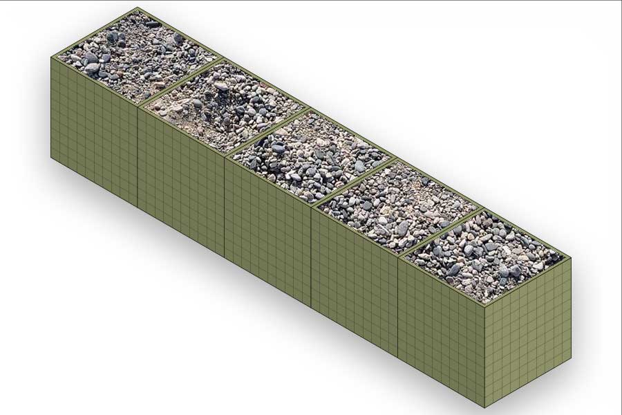 Конструкция применяется для защиты стратегически важных объектов, создания массивных барьеров и усиленных заграждений. Геотекстильная оболочка и сварная оцинкованная сетка обеспечивают сохранение формы и эксплуатационных характеристик на протяжении всего срока службы.