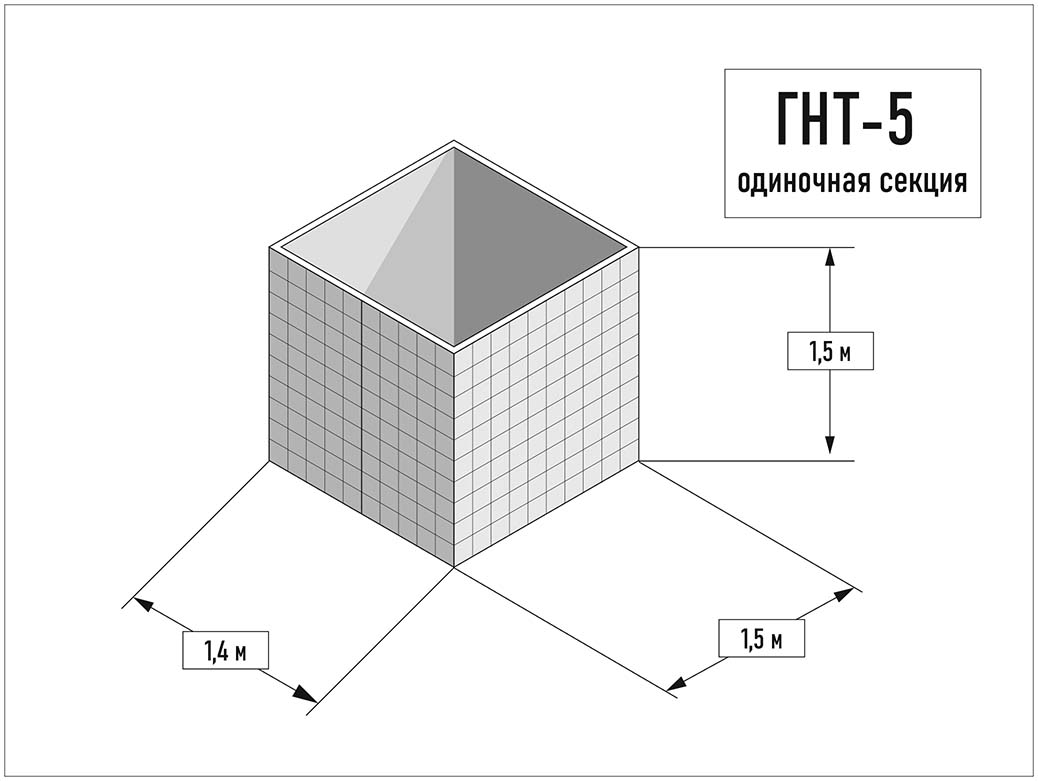 Одиночная секция ГНТ-5 используется для создания массивных защитных элементов и комбинирования с крупногабаритными габионами. Подходит для объектов с повышенными требованиями к устойчивости и массе конструкции.